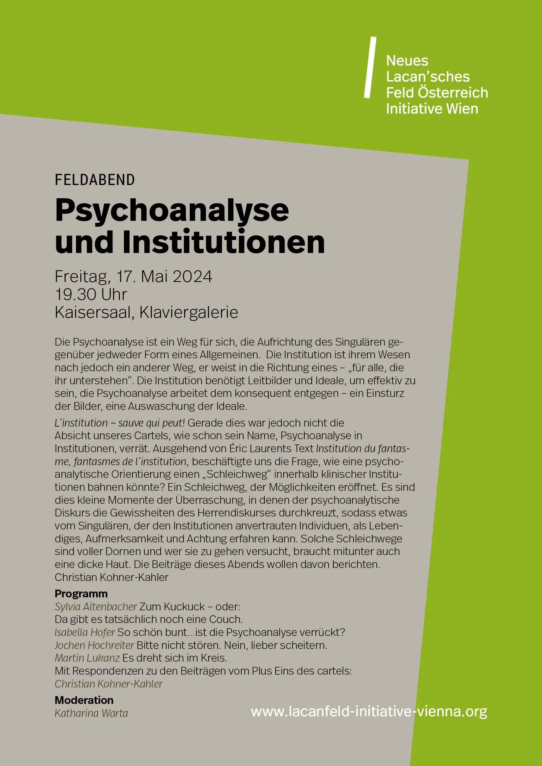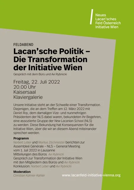 Unsere Initiative steht an der Schwelle einer Transformation. Diejenigen, die an dem Treffen am 12. März 2022 mit Daniel Roy, dem damaligen Vize- und nunmehrigen Präsidenten der NLS dabei waren, bekundeten ihr Begehren, eine assoziierte Gruppe der New Lacanian School (NLS) zu werden. Diese Bekundung hat Konsequenzen für die Initiative Wien, über die wir an diesem Abend miteinander sprechen werden.
