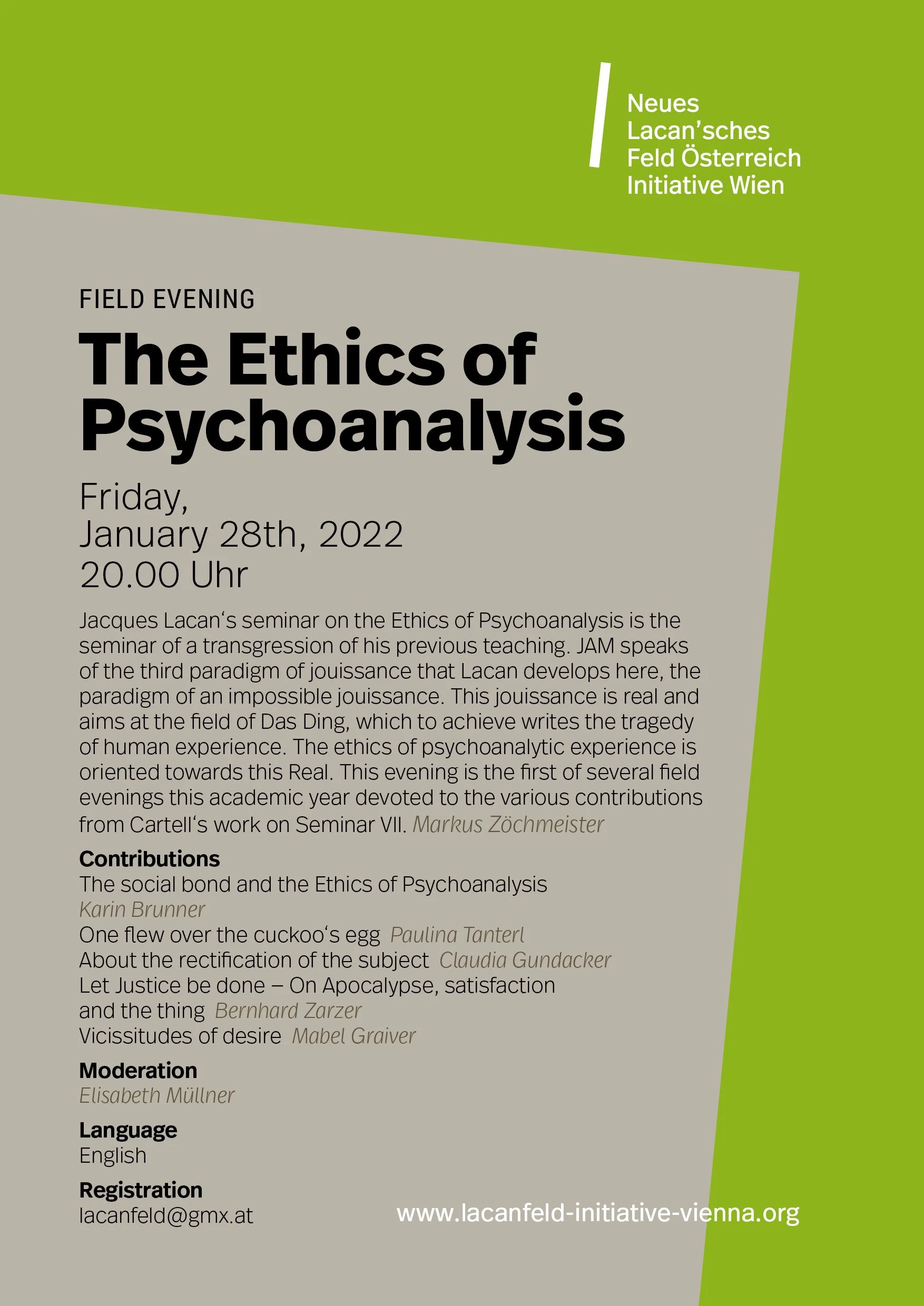 Lacan sagt in Seminar VII, Kapitel XVII Die Funktion des Guten, dass wir Realität mit Lust machen. Damit legt er das ganze Gewicht der Frage der Ethik auf die Praxis im doppelten Sinne. Einerseits auf die ethische Dimension des Handelns, also auch auf den analytischen Akt und andererseits auf die Herstellung, die Produktion ex nihilo. Dieser Abend widmet sich den Produktionen zu Seminar VII aus unterschiedlichen Cartellen, die begleitend zum dreiteiligen Seminar der VPS in diesem Studienjahr arbeiten.